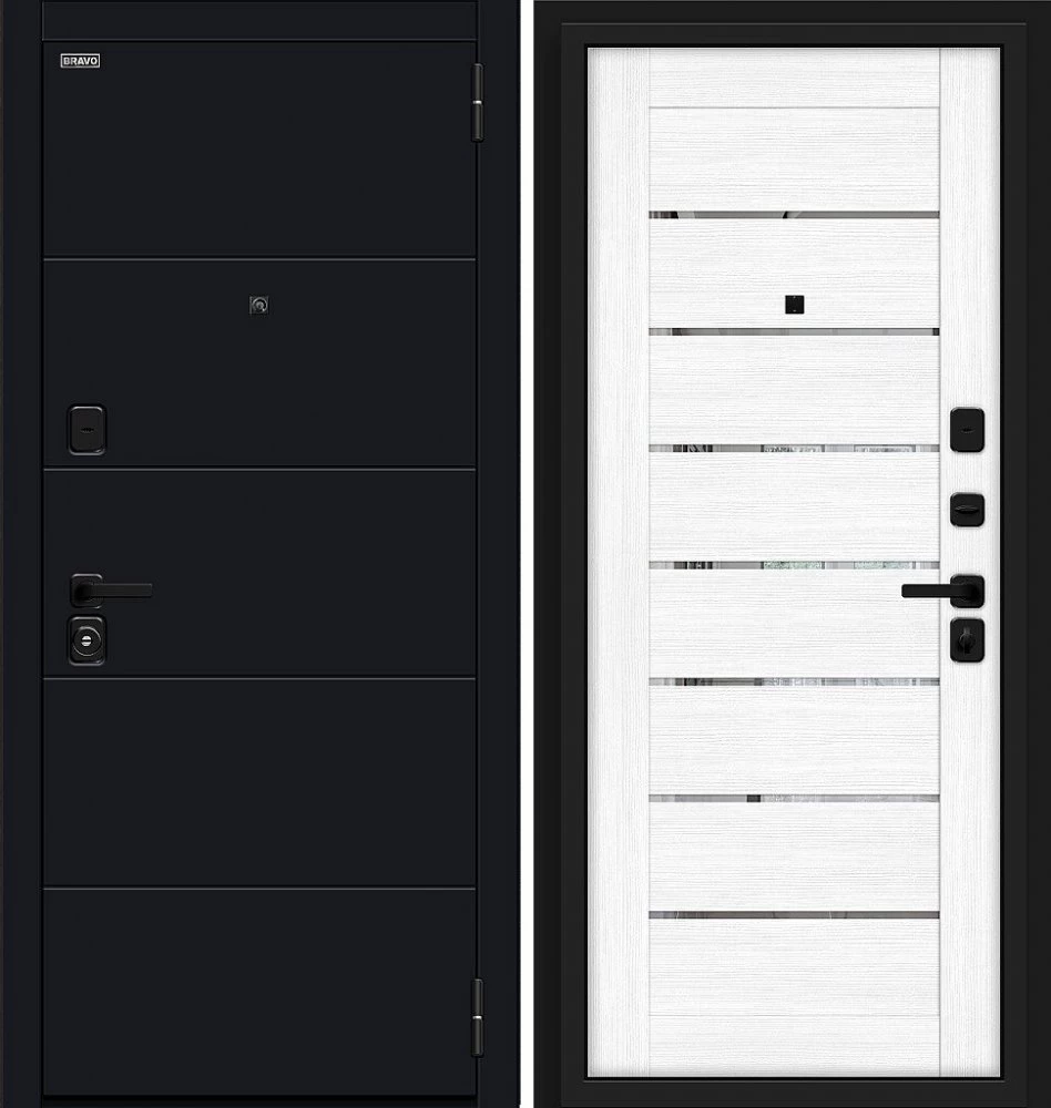 Надежная входная Дверь Браво Прайд Total Black/Snow Melinga премиум класса по цене 39 525 руб. Большая толщина стали защитит от проникновения в ваш дом, квартиру или коттедж. Используется очень качественная фурнитура: замки, цилиндры, ручки, защелки. Покрытие и отделка двери изготовлено под внимательным контролем производителя. Дверь имеет долгий срок службы и гарантию.